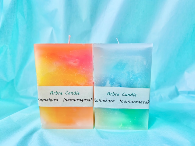 「グラデーション」 大きなグラデーションキャンドル。 空を見上げた時、太陽の光で輝いている木々からインスピレーションを受けて制作しました。 災害時にも役にたちますので、普段から少しずつ灯し真ん中を沈めておけば、ランタンのようになります。 ☆サイズ 7.5cm×7.5cm×高さ10cm (重量 564g) ☆一つ一つ手作りのため、外観やサイズには微細な違いがある場合がございます。あらかじめご了承ください。 ☆☆ご使用時のご注意☆☆ *火を扱う際は十分注意し、目を離さないようにしてください。 *使用・保管時に事故や怪我が生じた場合については責任を負いかねますのでご了承ください。 *添付のアテンションカードをご一読ください。 ~小さな灯りで優しい時間を~