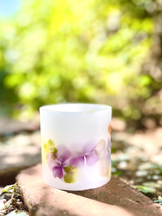 「Promenade」 美しい花々が散りばめられた、かわいらしいキャンドルです。たくさんの花が咲く散歩道(Promenade)を思い出し、制作しました。 灯すことで浮かび上がる花のシルエットは、違った表情を覗かせ、心に穏やかなひとときをお届けします。 使用しているドライフラワーは庭の花を中心に、アトリエで手作業で加工しています。手作りのあたたかさをお届けしたい思いで制作しています。 ☆原材料 パラフィン ☆サイズ 直径6cm×高さ9.5cm ☆燃焼時間 約20時間(環境により変動あり) ☆ハンドメイドのため、写真のデザインと色の見え方など若干の違いがございます。あらかじめご了承ください。 ☆☆キャンドル使用時のご注意☆☆ *キャンドルを使用する際は目を離さず、火の取り扱いに充分気を付けてください。 *使用時、保管時に起きてしまった事故や怪我、破損に関しましては責任を負いかねますのであらかじめご了承願います。 *添付のアテンションカードをご一読ください。 ~小さな灯りで優しい時間を~